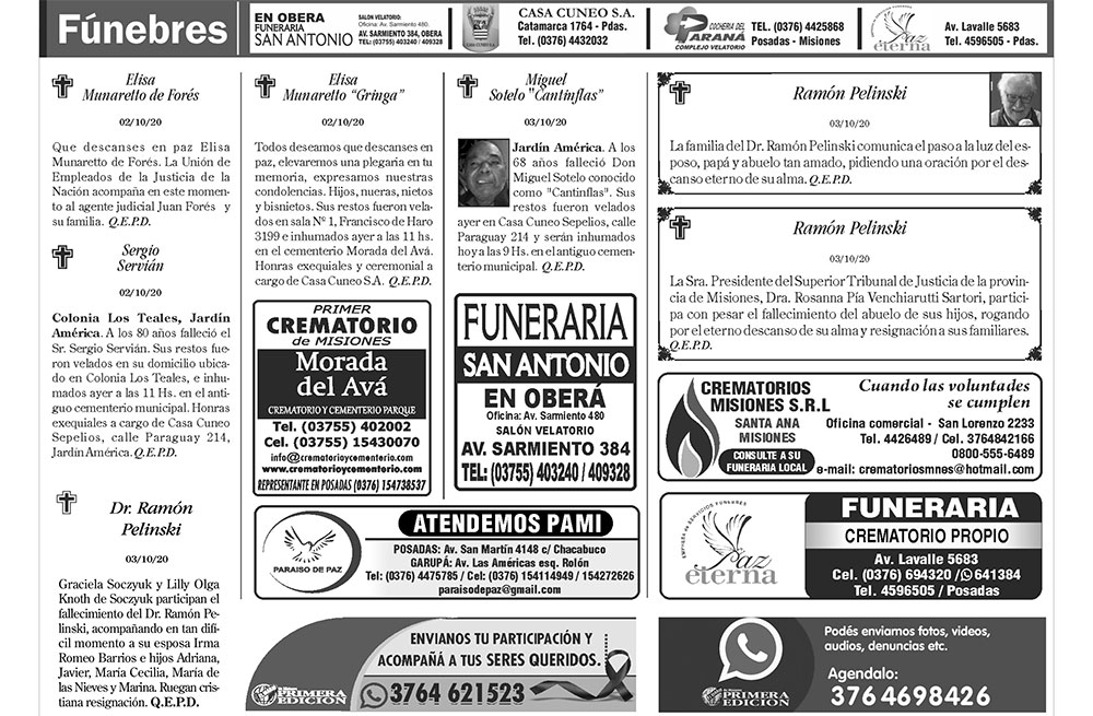 Fúnebres el domingo 4 de octubre de 2020
