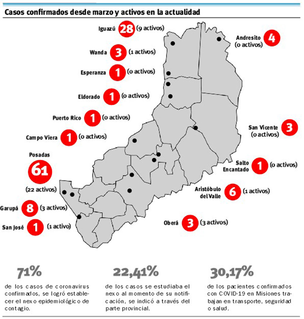 De los 125 COVID-19 en Misiones, 61 son vecinos de Posadas, por lo que el 49,2% de los afectados viven en esta ciudad. No sólo esta es la localidad con más contagios, también es la que más pacientes con el virus activo tiene en la actualidad, con el 56,4% de los mismos. Vale aclarar que los pacientes están bajo aislamiento, por lo que el riesgo mayor está dado en las personas que hoy no saben que están enfermas y pueden contagiar.
