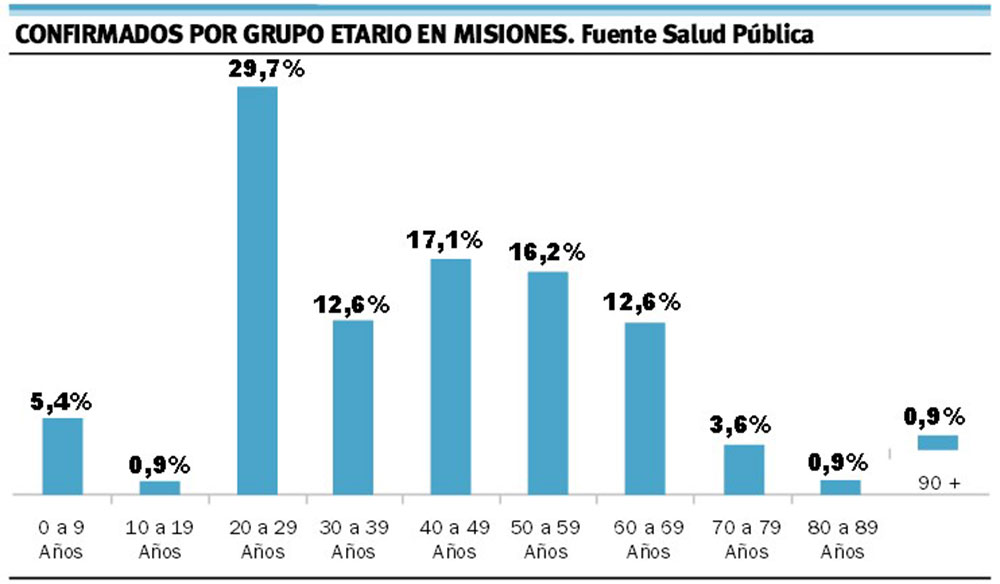 En Misiones, la franja etaria que acumula mayor cantidad de contagios del SARS CoV-2 es la que va de los 21 a los 30 años (el 27% del total), seguida por la franja que va de los 31 a los 40 años (el 17%) tanto en hombres como mujeres, aunque la estadística local muestra que los hombres son más vulnerables al virus en todas las edades.