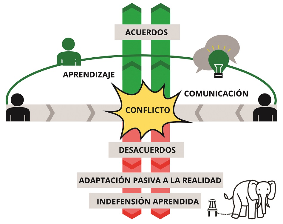 Todo aspecto de conflicto o malestar, individual, de pareja, parental, en un grupo o colectivo, debe expresarse de forma explícita: identificar claramente las posturas y las necesidades de los implicados -sin menoscabar su importancia- y articular una tarea común en la que todas las partes cedan y acepten su rol en la misma. Cuanto mejor sea la comunicación en este proceso, menos posibilidad de conflicto existirá.