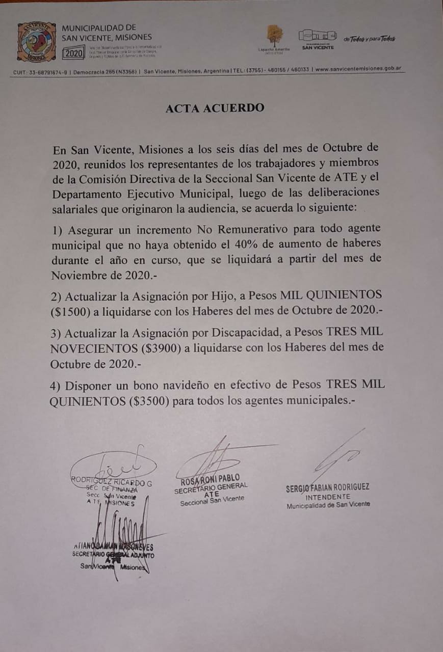 Por otra parte, en San Vicente hoy se reunieron los representantes de los trabajadores, miembros de la Comisión Directiva de la Seccional de ATE de esa localidad y autoridades municipales quienes acordaron un incremento no remunerativo para todo agente municipal que no haya obtenido el 40% de aumento de haberes durante el año en curso, el cual se liquidará en noviembre de 2020.