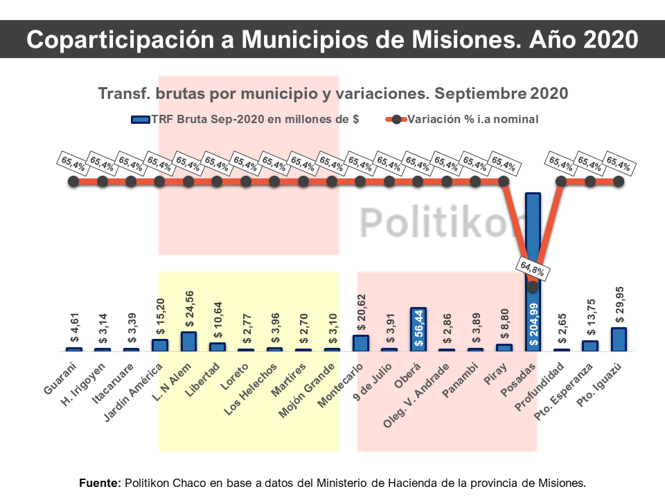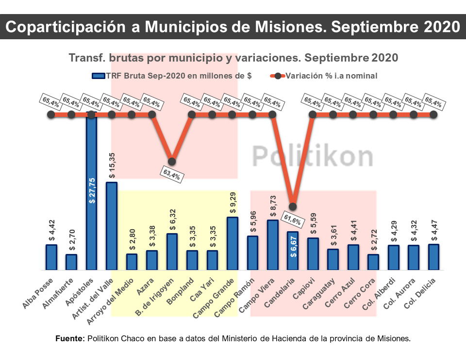 En números, la coparticipación bruta de septiembre 2020 a los municipios misioneros fue por un total de $810,9 millones de pesos, y luego de una serie de retenciones a los municipios por diferentes conceptos (particularmente, pago de préstamos, adelantos o programas municipales), la coparticipación neta, es decir lo efectivamente recibido por los municipios, terminó totalizando $721,6 millones.