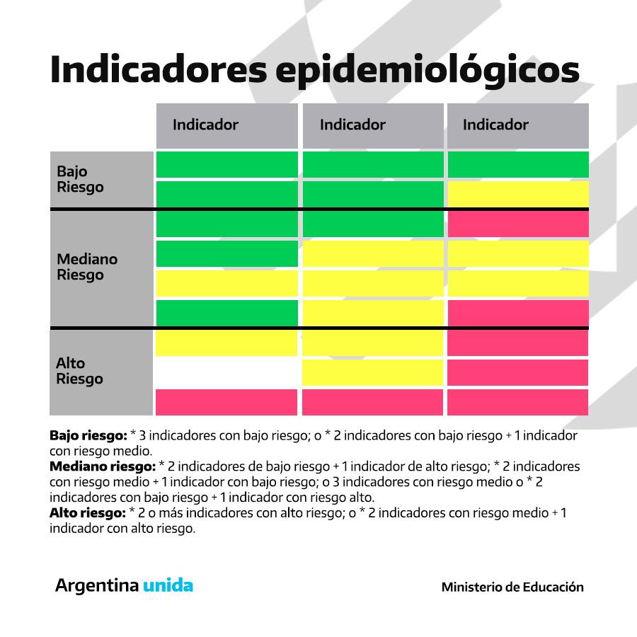 El documento consiste en indicadores epidemiológicos complementarios al protocolo marco aprobado en el mes de julio que permiten orientar a las jurisdicciones en la toma de decisiones, con información objetiva en relación al nivel de riesgo de contagio de la comunidad educativa, especialmente para áreas urbanas y periurbanas.