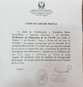 Según comunicaron desde la Junta de Clasificación y Disciplina Rama Secundaria y Superior, desde el martes 13 y hasta el último día del mes de octubre, se habilitará la inscripción para profesores en educación de la UNaM.