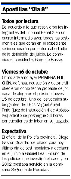 La octava jornada de debate oral y público a Gabriel Cristóbal Leal se concretó este jueves en la sala de audiencias del Tribunal Penal 2 de esta capital y, a diferencia del miércoles que sólo declaró un oficial de la Policía provincial, fueron siete los citados que cumplieron con sus testimoniales.