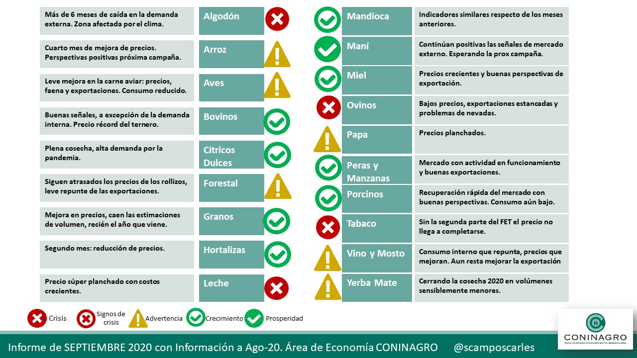 La Confederación Intercooperativa Agropecuaria Limitada (CONINAGRO) publicó el nuevo informe “Semáforo de las Economías Regionales” del mes de agosto y reveló que hay cuatro actividades en rojo, seis en amarillo y nueve en verde.