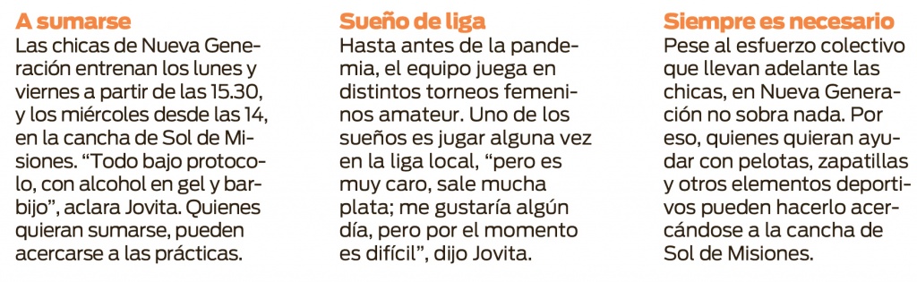 A puro fútbol, las chicas de Nueva Generación se ganaron el respeto de todo Sol de Misiones, que de a poco se arrima a mirar por las tardes al grupo que patea sobre la canchita de tierra. Quién dice. Quizás la pelota tenga sorpresas para alguna de ellas. “Me gustaría que las chicas tengan oportunidades, en la vida y en el fútbol. Si es con la pelota al lado, que vayan a Boca, a River. Que puedan transformar su vida con el fútbol y salir adelante. Todo cuesta, hay que poner plata y tiempo, pero por ellas, vale la pena”, cierra Jovita.