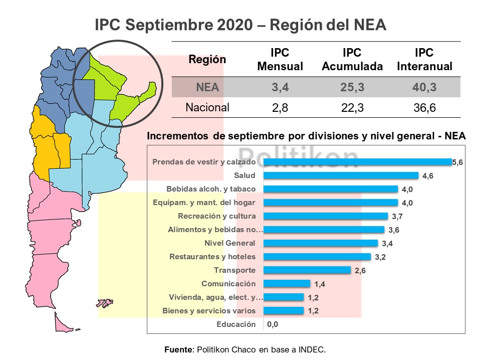 En ese marco la región del Nordeste tuvo en septiembre 2020 un alza del IPC del 3,4% y es la primera vez desde marzo que se observa que el alza de precios fue superior a los tres puntos en la región; comparada con el resto de las regiones del país, tuvo el segundo mayor incremento del índice; el mayor incremento lo tuvo Cuyo con el 3,6%.