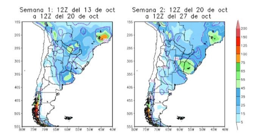 Mientras que para la semana del 20 al 26 de octubre, existe una baja probabilidad de ocurrencia de precipitaciones del orden de los 5 milímetros por día, en el tramo medio de la cuenca del río Uruguay del 21 al 24 de octubre. Los modelos numéricos no muestran precipitaciones importantes para el resto de las cuencas bajo vigilancia a lo largo de esta segunda semana de pronóstico.