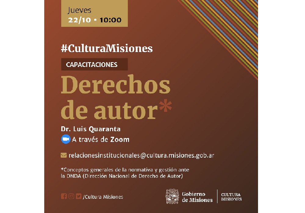 En el marco de las asesorías gratuitas para artistas misioneros, la Secretaría de Estado de Cultura de la Provincia convoca a una actividad gratuita y vía Zoom donde se explicará los conceptos generales y alcances de la normativa que regula la Propiedad Intelectual y Derecho de Autor en la Argentina.