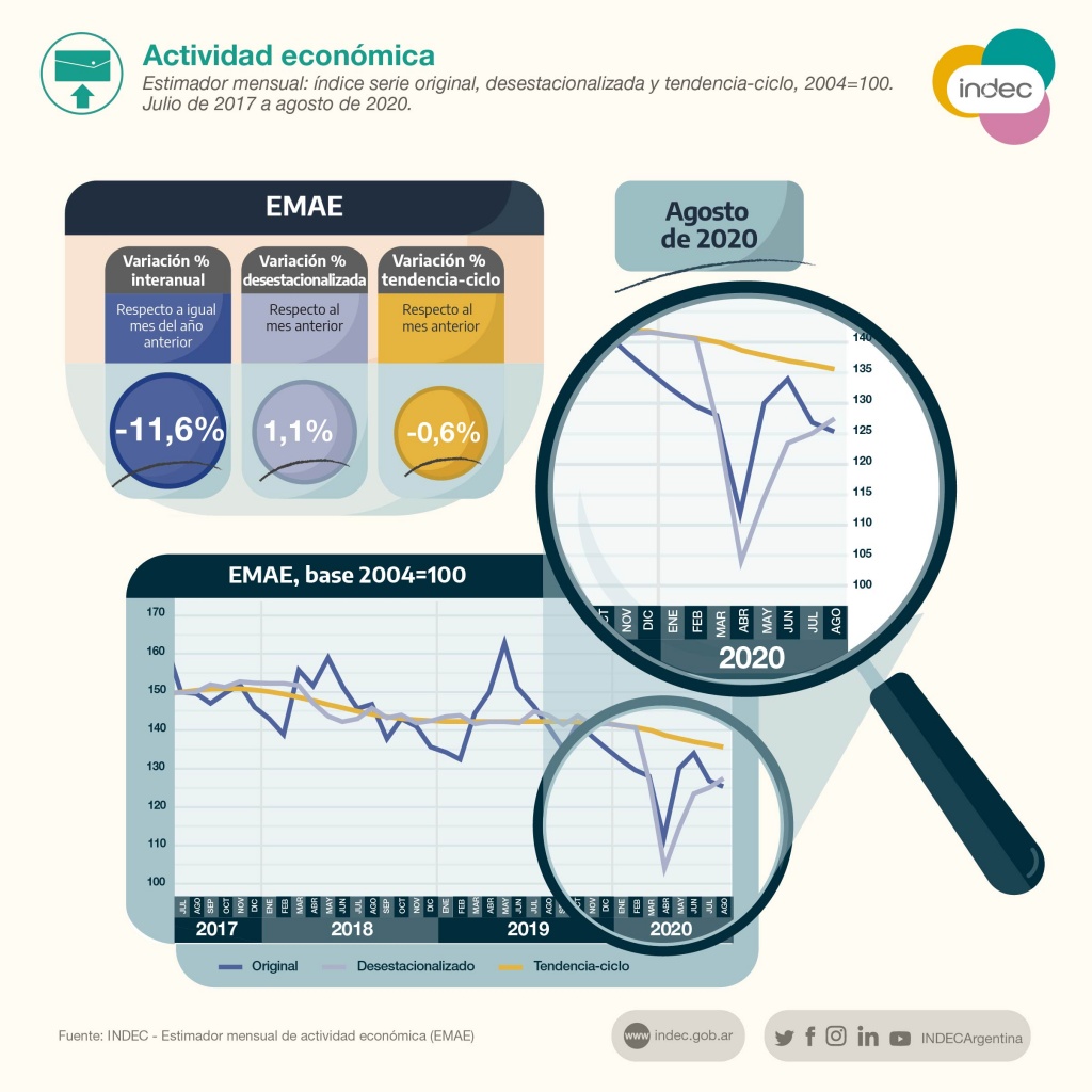 De este modo, golpeada por la pandemia y las medidas sanitarias adoptadas, el Estimador mensual de actividad económica (EMAE) acumuló en los primeros ocho meses del año una caída del 12,5% contra igual período de 2019.