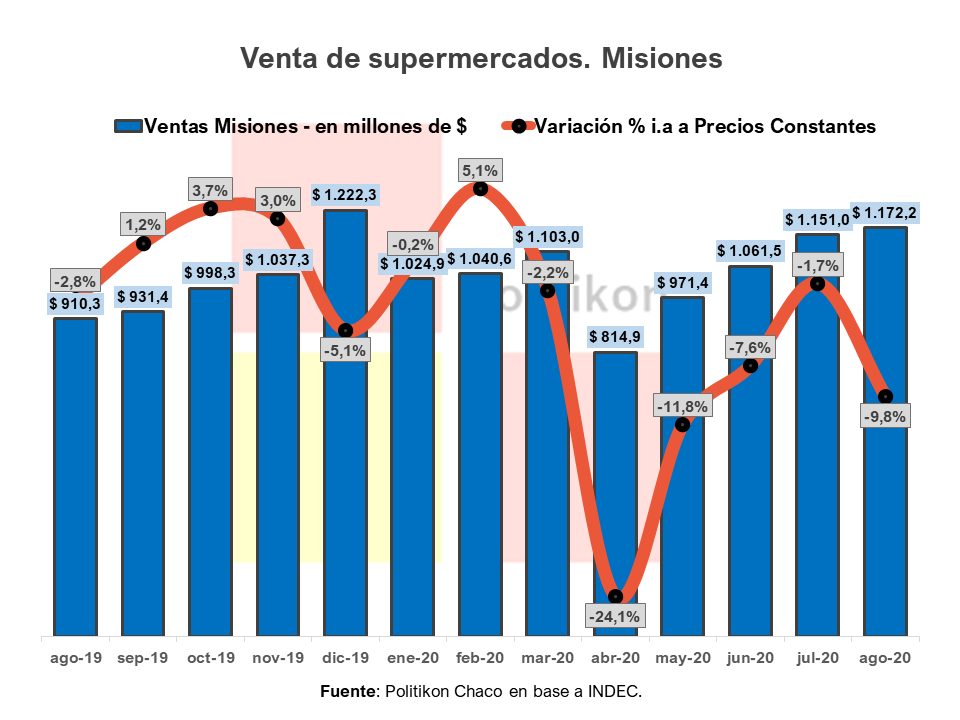 Según informó el INDEC, el total nacional de ventas en supermercados en agosto 2020 fue por $80.497,9 millones, incrementándose un 34,7% medido a precios corrientes; y visto en términos reales (en pesos constantes), cayó un 5,7% interanual.