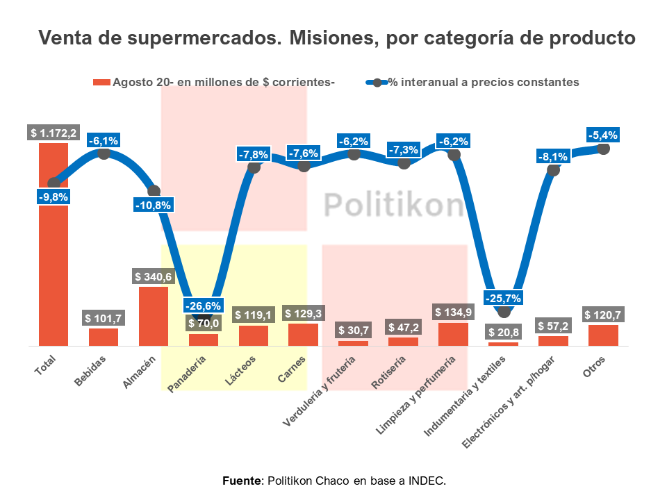 Observando los datos según grupo de artículos, en Misiones ninguno de los once grupos de artículos tuvo incrementos interanuales reales, ya que todas sufrieron caídas de distinta magnitud: la mayor se observa en el rubro de “Panadería” con -26,6% real, seguida por “Indumentaria, calzados y textiles para el hogar” (-25,7%) y “Almacén” (-10,8%).