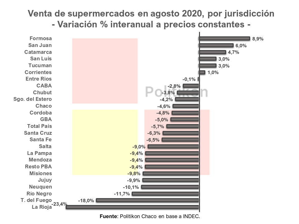 En la comparación regional, las ventas de agosto muestran la misma situación que en julio: Formosa (+8,9% eal) y Corrientes (+1,0% real) mostraron incrementos; mientras que Misiones (-9,8%) y Chaco (-4,6%) tuvieron caídas, por lo que la provincia de la tierra colorada tiene la mayor caída del NEA. A nivel nacional, Formosa es de hecho la provincia con el mayor incremento (+8,9% real), al tiempo que la provincia que con la mayor caída es La Rioja (-23,4% real).