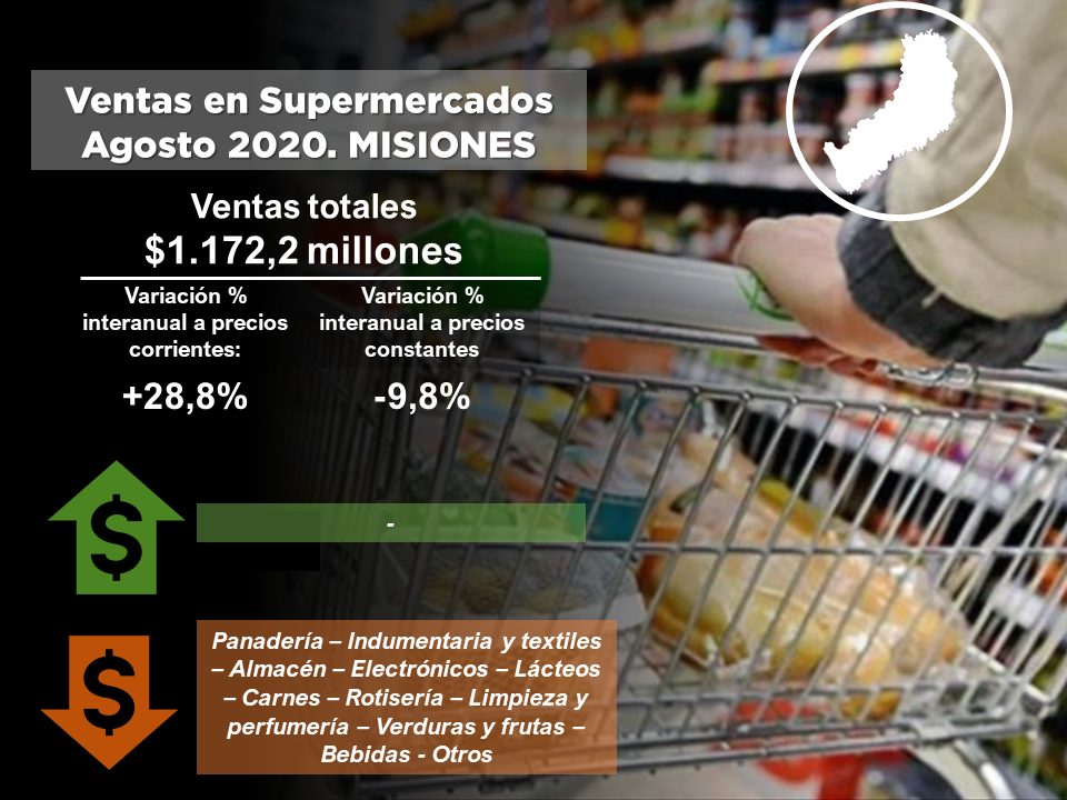 Según informó el INDEC, el total nacional de ventas en supermercados en agosto 2020 fue por $80.497,9 millones, incrementándose un 34,7% medido a precios corrientes; y visto en términos reales (en pesos constantes), cayó un 5,7% interanual.