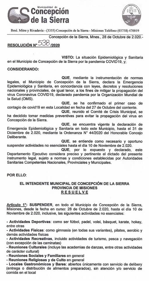 En consecuencia mediante la Resolución 538 se estableció “suspender en todo el municipio desde la fecha en curso hasta el 10 de noviembre inclusive las siguientes actividades esenciales”: