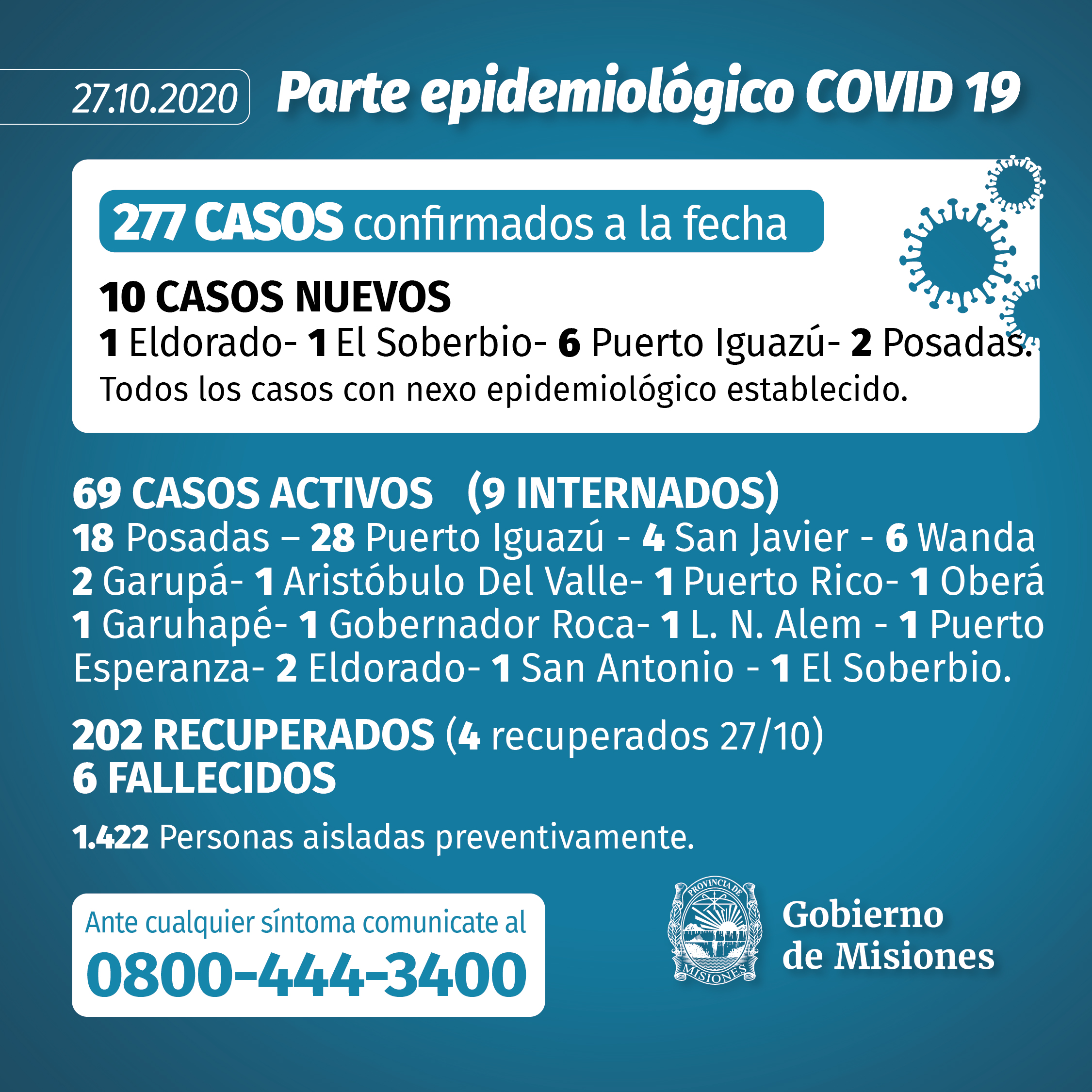 El Soberbio volvió a tener cero casos positivos de COVID-19, ya que la paciente que había dado positivo en la primera prueba, en la contraprueba dio negativo. “La Provincia nos informó que la paciente que dio a luz ayer, cuyo primer análisis había sido positivo, en la contraprueba dio negativo. Esto significa que en El Soberbio seguimos con cero casos y vamos a seguir con el protocolo que veníamos manejando“, ratificó el director hospital de El Soberbio, Alberto Báez, en entrevista con la radio local 90.1 Siempre Joven.
