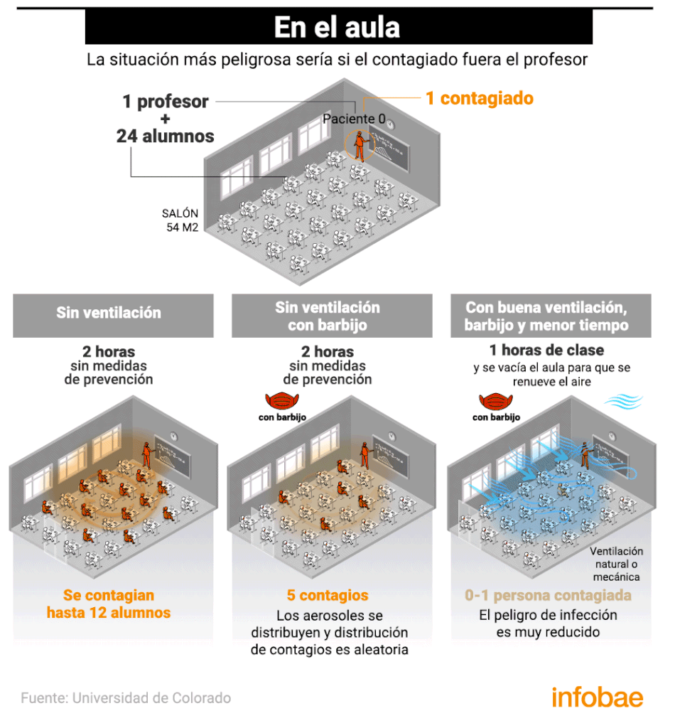 La situación más peligrosa se daría en un aula sin ventilación en la que la persona infectada fuera el profesor. Si pasaran dos horas de clase con un docente enfermo, sin tomar ninguna medida contra los aerosoles, la probabilidad de contagio alcanzaría hasta a 12 alumnos. Si todos llevaran máscaras faciales, sólo cinco se podrían contagiar. Si además se ventila durante la clase (de forma natural o mecánica) y se para después de una hora para renovar completamente el aire, el riesgo se desploma.