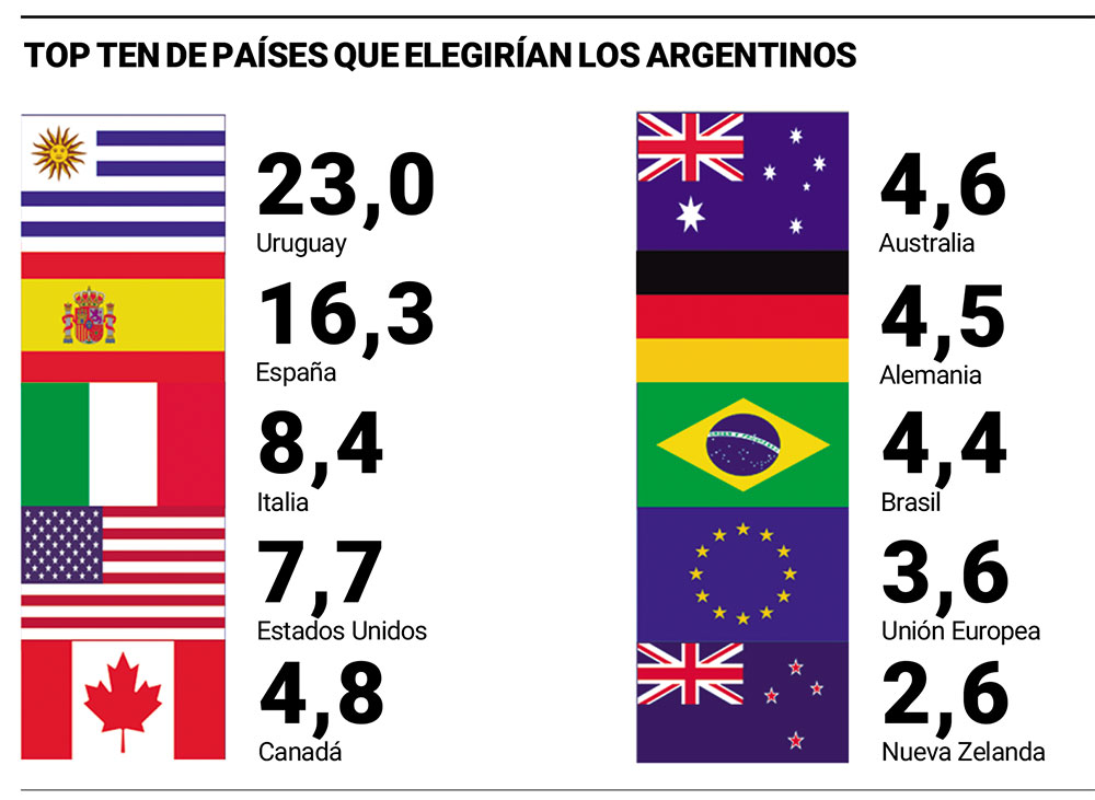 Entre los entrevistados por IPD hubo diversidad de destinos a los que les gustaría ir. Pero “eligieron países concretos como Uruguay (23%), España (16%) o Italia (8%). ¿Qué tienen en común esos tres países con Argentina? Lo que nosotros observamos es que hay una característica cultural similar con la Argentina. Mientras que el Uruguay es también por una cuestión de proximidad”, opinó Solmoirago.