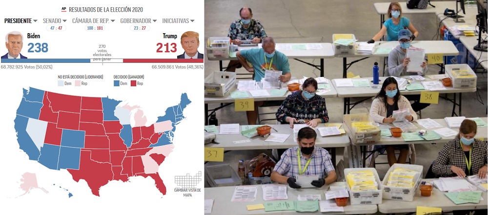 • Las esperanzas de Biden de una victoria rápida se desvanecieron. El demócrata le apuesta a Michigan, Wisconsin y Pensilvania, pero hasta el momento Arizona parece ser el único estado péndulo que ha podido convertir al bando azul.