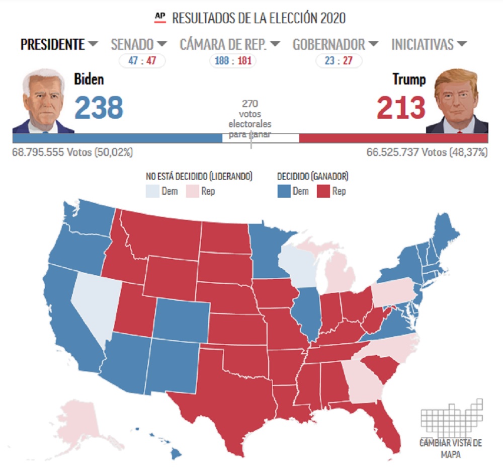 • Los ojos del mundo están puestos en Michigan, Pensilvania, Wisconsin, Georgia y Nevada. En estos estados aun no están claros los resultados y faltan boletas por contar. Serán definitivos para determinar al ganador de los comicios.