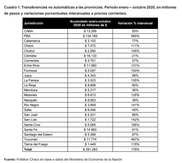 Se destaca a su vez que “las transferencias no automáticas hasta octubre inclusive representan a su vez el 16,4% de las transferencias automáticas, pero con grandes disparidades hacia dentro de las provincias: mientras que en San Luis equivalen a solo el 4,7%, en la provincia de Buenos Aires alcanza el 33,8%. Consolidando las transferencias automáticas y no automáticas, la provincia de Buenos Aires se lleva el 25,8% del total de los recursos distribuidos, aumentando su participación en relación al mismo periodo de 2019, cuando se llevó el 22% del total”, advirtieron.