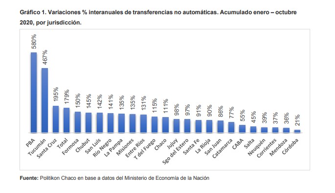 Como se mencionó supra, la provincia de Buenos Aires registra el mayor crecimiento de recursos discrecionales, con un aumento interanual del 580% y le sigue la provincia de Tucumán con un alza del 467%; Santa Cruz (+195%); Formosa (+150%), Chubut (+145%), San Luis (+142%), Río Negro (+141%), La Pampa (+135%), Misiones (+135%), Entre Ríos (+131%), Tierra del Fuego (+115%) y Chaco (+111%) son las otras provincias con incrementos superiores al 100%.