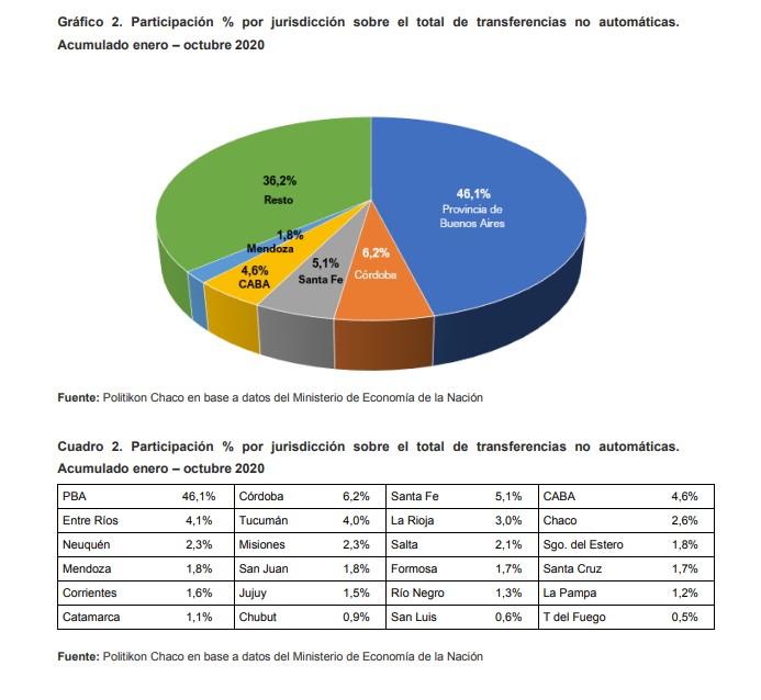 Asimismo, “observando el reparto por provincias, la mayor parte de los envíos fueron para la provincia de Buenos Aires, que con un total de $134.185 millones representa el 46,1% del total de las transferencias no automáticas. Además, los cinco distritos más poblados del país (provincia de Buenos Aires, Córdoba, Santa Fe, Ciudad Autónoma de Buenos Aires y Mendoza) concentran el 63,8% del total de los envíos (esos cinco distritos representan el 65,9% del total de los habitantes del país)“.