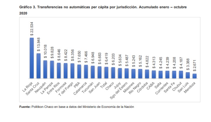 Sin embargo, manifestaron que “hacia dentro de esas jurisdicciones, la distribución no es homogénea en relación a su población. Medidos en términos per cápita, las provincias de La Rioja, Santa Cruz y Neuquén acumularon transferencias por más de $10.000 por habitante, mientras que Mendoza no llega a los $3.000”.
