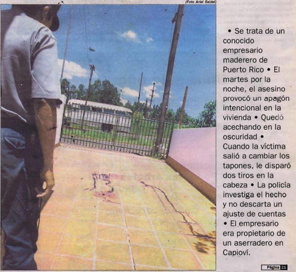 El 29 de diciembre de 1998 por la noche, el empresario maderero Oscar Griss (47) fue ultimado con dos certeros disparos a quemarropa en la cabeza, cuando salió a revisar el medidor de luz ubicado en la vereda de su vivienda en Puerto Rico.