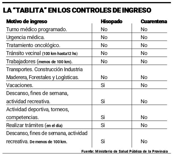 No se exigirá el hisopado obligatorio para turnos médicos programados (debiendo exhibirse constancia a tal fin); una urgencia médica comprobable; tratamientos oncológicos, tránsito vecinal en un radio de hasta 100 kilómetros por hasta 12 horas; traslado de trabajadores de menos de 100 kilómetros a la redonda; como tampoco para trabajadores de la construcción, la industria maderera forestal y trabajos de logística.