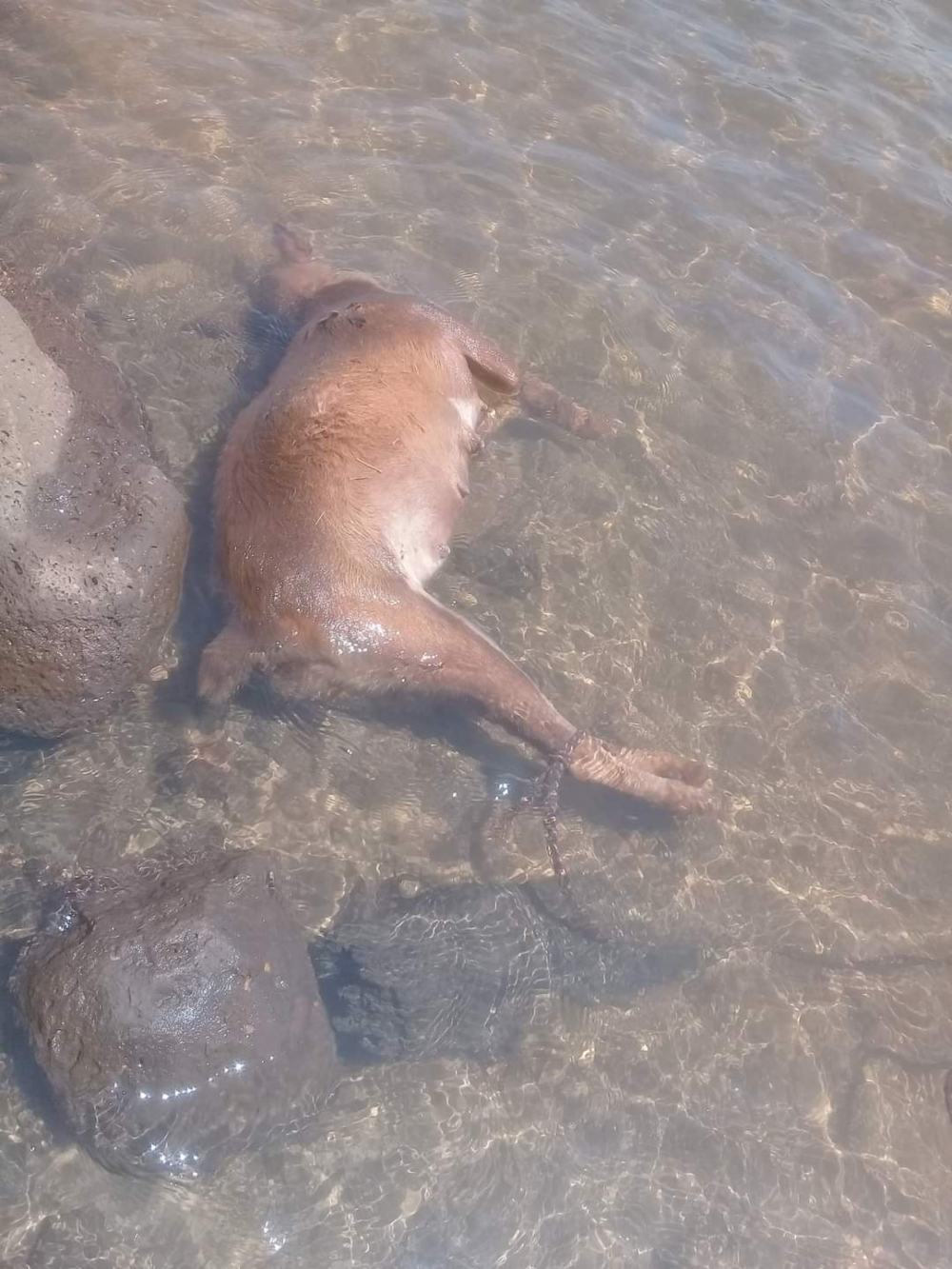 “Esta mañana fuimos a la costanera ya que el río está bajo y hay playa, caminamos costeando el río y encontramos esta aberración. Me partió el alma, no puede haber gente tan m…, basura sin corazón, tengo tanta bronca. No pueden ser tan HDP, atar un animalito así y tirarlo al río para que muera, son una c…”, expresó indignada la joven.