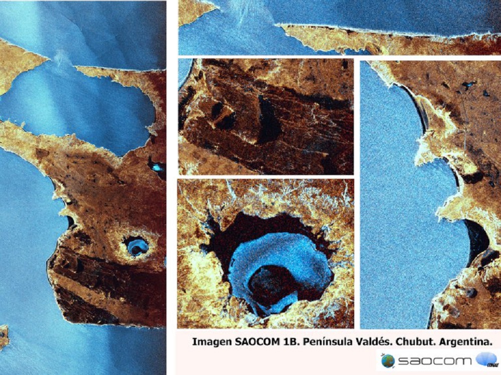 La primera imagen del satélite SAOCOM-1B fue captada sobre la Península de Valdés en la costa de la provincia del Chubut. En esta superficie el poder de penetración del radar SAR permite detectar el contenido de agua de la Salina Grande al Sur y del Salitral al Norte -tanto en la superficie como, incluso, dentro de la capa salina- que en la imagen se ve en tonos azulados.