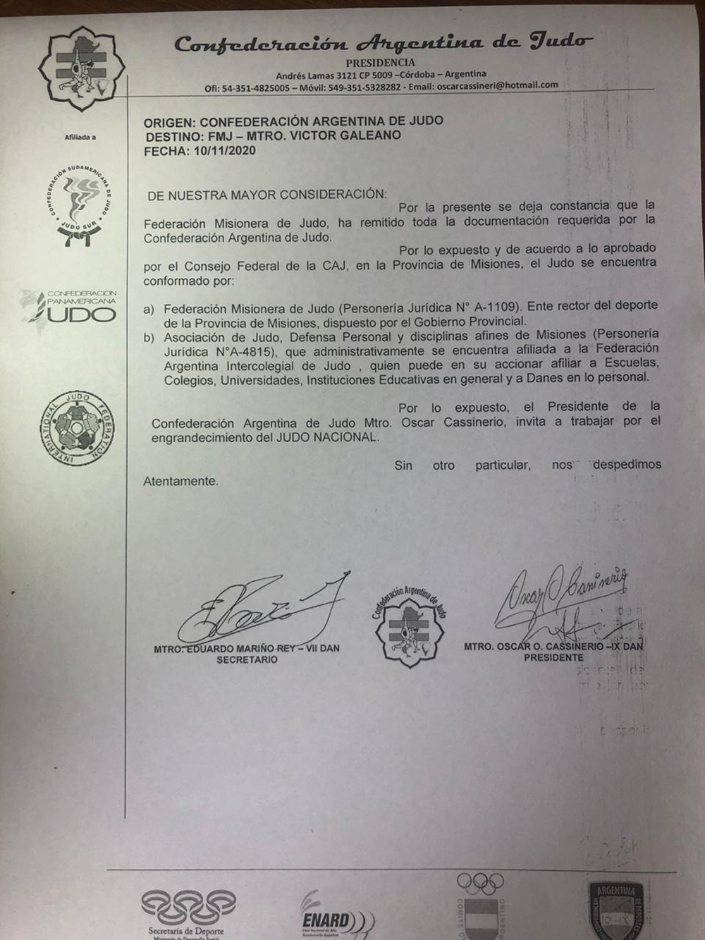 La misiva, fechada ayer y que cuenta tanto con la firma del presidente de la Confederación Argentina de Judo (CAJ), Oscar Cassinerio; como del secretario de esa entidad, Eduardo Mariño Rey; certifica a las dos entidades como conformadoras del judo en la provincia, aunque reconoce a la Federación como “ente rector del deporte de la provincia de Misiones”.