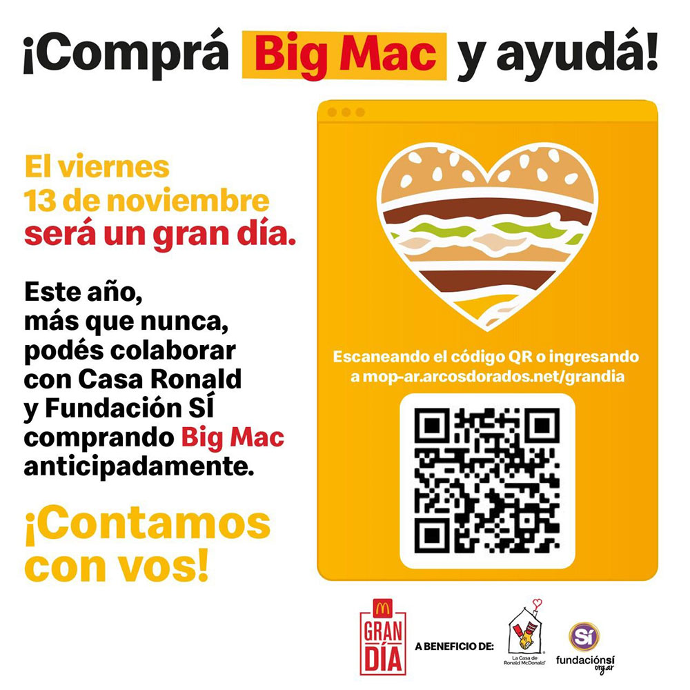 Por otra parte, como todos los años, los que quieran colaborar pueden también comprar la hamburguesa Big Mac por AutoMac, take away o pedirla por McDelivery a través de las distintas aplicaciones de envíos.