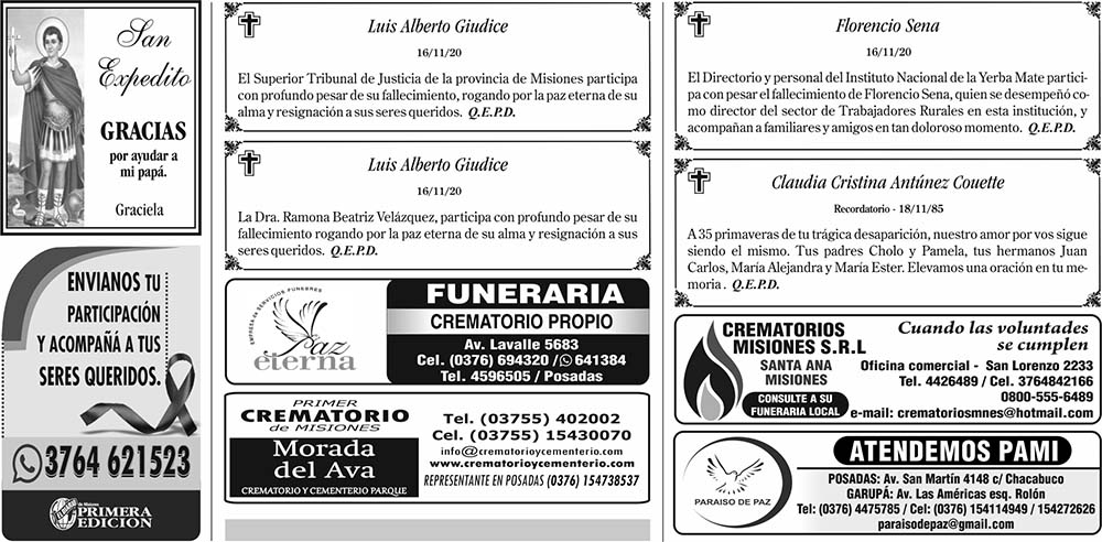 Fúnebres del miércoles 18 de Noviembre de 2020