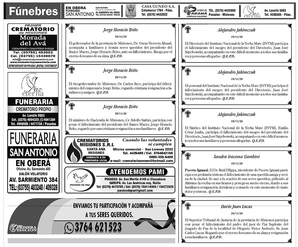 Fúnebres del sábado 21 de noviembre de 2020
