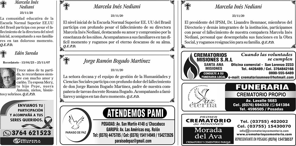 Fúnebres del miércoles 25 de Noviembre de 2020