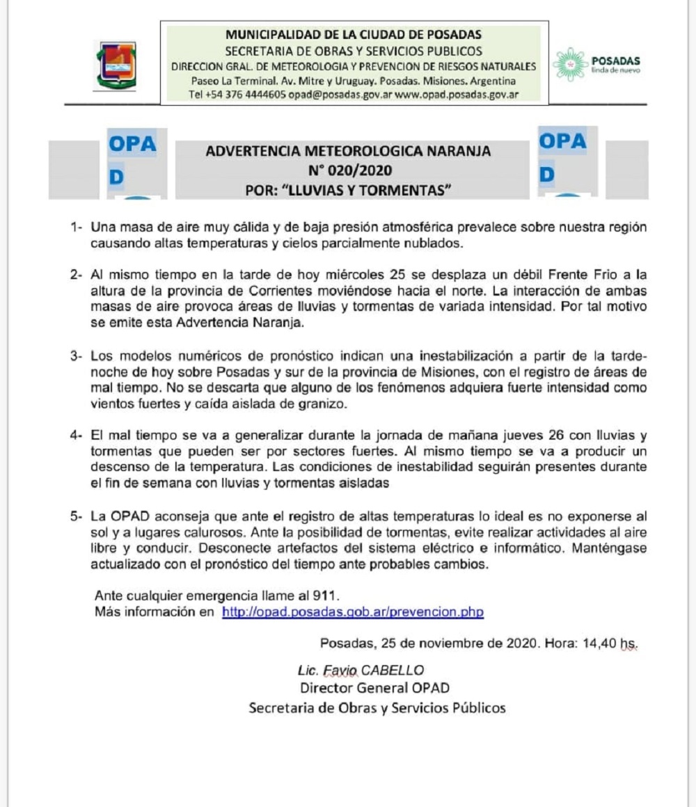 Desde la misma dependencia, se emitió en horas de la tarde una “alerta naranja” ante la posibilidad de inminentes lluvias fuertes y tormentas.