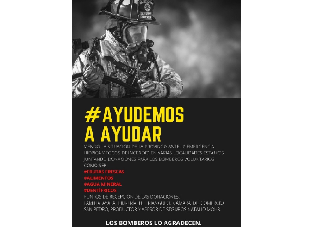 La convocatoria que lleva el slogan #Ayudemos a Ayudar, la Cámara Regional de Comercio Industria y Servicios de San Pedro, comerciantes y vecinos unieron fuerzas para conseguir colaboración para los Bomberos Voluntarios que están trabajando en los incendios forestales de toda la provincia.
