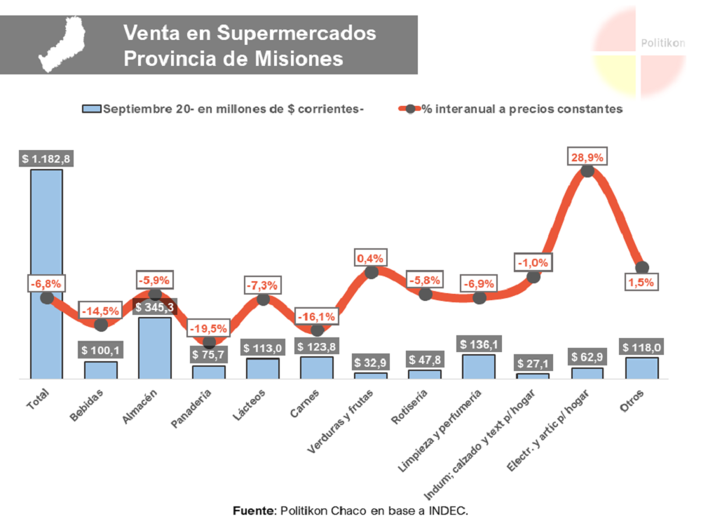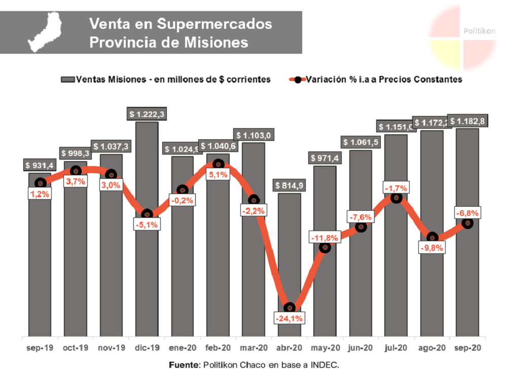 Según un informe publicado por la consultora Politikon Chaco, en base a datos del Instituto Nacional de Estadística y Censos (INDEC), Misiones experimentó durante septiembre de 2020 la séptima caída consecutiva de ventas en supermercados medidas en términos reales.