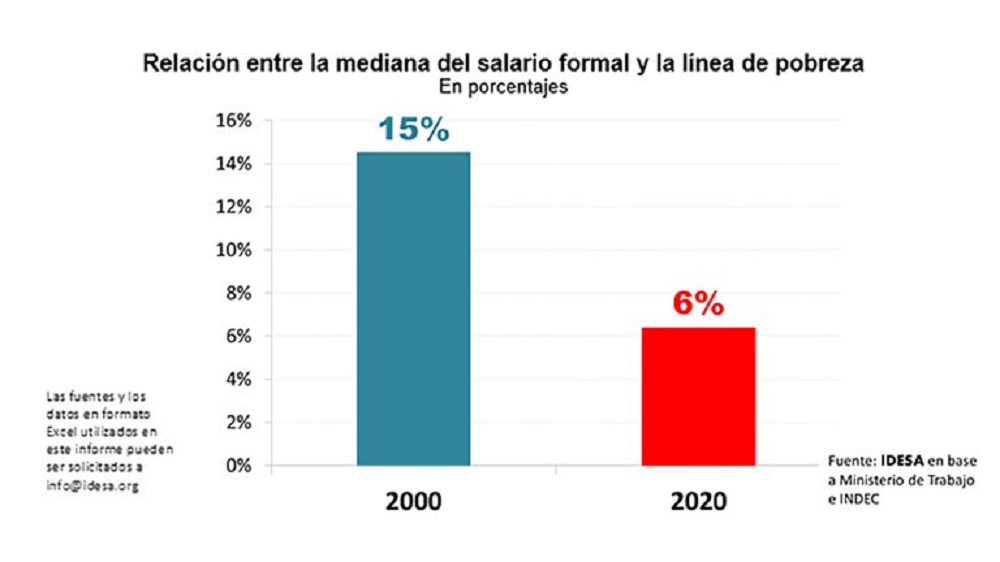IDESA asegura que la línea de pobreza se acerca al nivel medio de los salarios que pagan las empresas a sus empleados debidamente registrados (en blanco). “Mucha gente, aún teniendo un empleo privado registrado, no logra salir de la pobreza. Es la consecuencia de haber aplicado y seguir aplicando pésimas políticas públicas que destruyen la productividad”, indicó el Instituto.