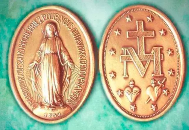 Entonces alrededor de la cabeza de la Virgen se formó una aureola con las siguientes palabras: “Oh María sin pecado concebida, ruega por nosotros que recurrimos a Ti”. Y una voz dijo a Catalina: “Hay que hacer una medalla semejante a esto que estas viendo. Todas las personas que la lleven sentirán la protección de la Virgen”, y apareció una M, sobre la M una cruz y debajo los corazones de Jesús y María, imágenes que hoy conforman la Medalla Milagrosa.
