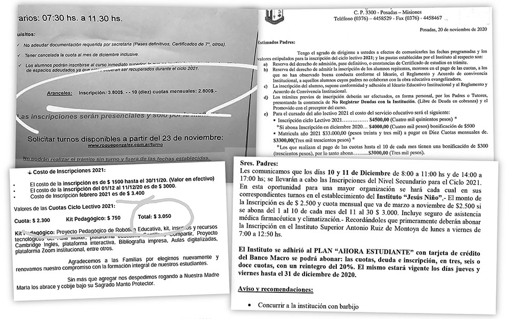 Apenas un mes después de que el Servicio Provincial de Enseñanza Privada de Misiones (SPEPM) anunciara que postergó para el primer trimestre del próximo año el análisis y aprobación del porcentaje de aumento de cuotas de los colegios privados, los padres de alumnos que asisten a colegios públicos de gestión privada advirtieron a PRIMERA EDICIÓN que ya les están confirmando el valor de la cuota que pagarán a partir de 2021.