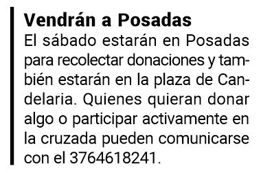 Quienes se quieran sumar con donaciones o para participar de la cruzada, se pueden comunicar al teléfono 3764618241. “También pueden esperarnos con las donaciones en los puntos de descanso que es Garupá y el Cuarto Tramo de la costanera” dijo Ramón aunque agregó que “si pueden escribirnos antes de la cruzada para buscar las donaciones es mejor porque entonces podemos llevar todo de manera ordenada y si hace falta restaurar algún juguete o arreglar la ropa, podemos hacerlo”.