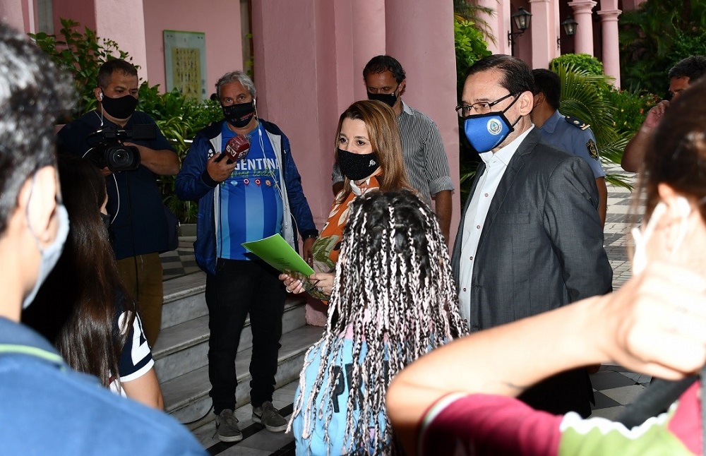 Tras mantener una charla con los alumnos, escuchando sus inquietudes y recepcionando el petitorio, la ministra -acompañada por el subsecretario de Gestión Educativa, Julio Navías- dijo a la prensa que los actos de colación, con estrictos protocolos y al aire libre, van a ser autorizados, no así las fiestas de recepciones de fin de año.