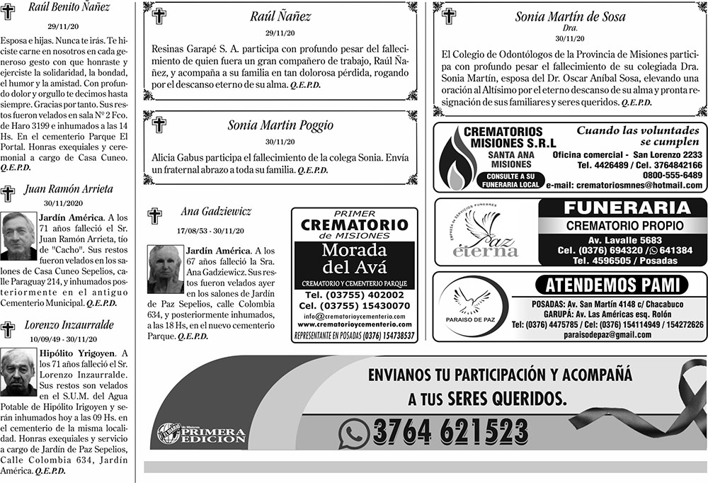 Fúnebres del Martes 1 de Diciembre de 2020