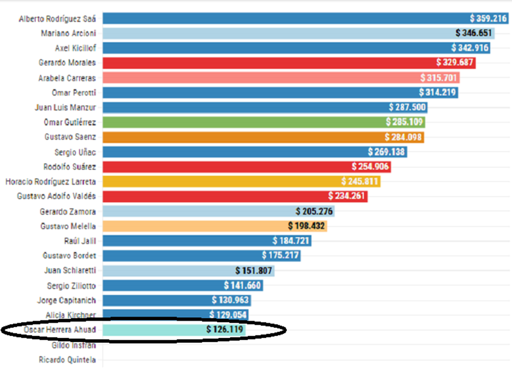 En el otro extremo se encuentra el misionero, Oscar Herrera Ahuad, quien informó su recibo de sueldo de $126.119. Los datos fueron publicados por el portal Infobae en base a una investigación y pedidos de acceso a la información pública.