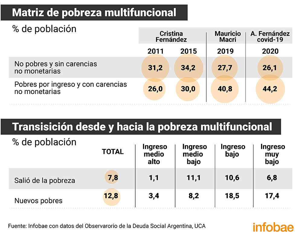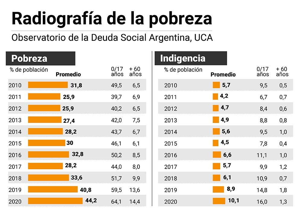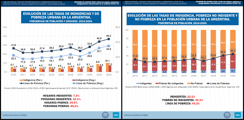 Una de las conclusiones del trabajo, que contempla datos correspondientes al cuatrimestre comprendido entre julio y octubre, es que el 44,2% de la población total está bajo la línea de pobreza en los centros urbanos representados por el relevamiento; es un índice superior al de 2019 (entonces fue de 41%), un año en el que había tenido una suba significativa desde el 34% de 2018.