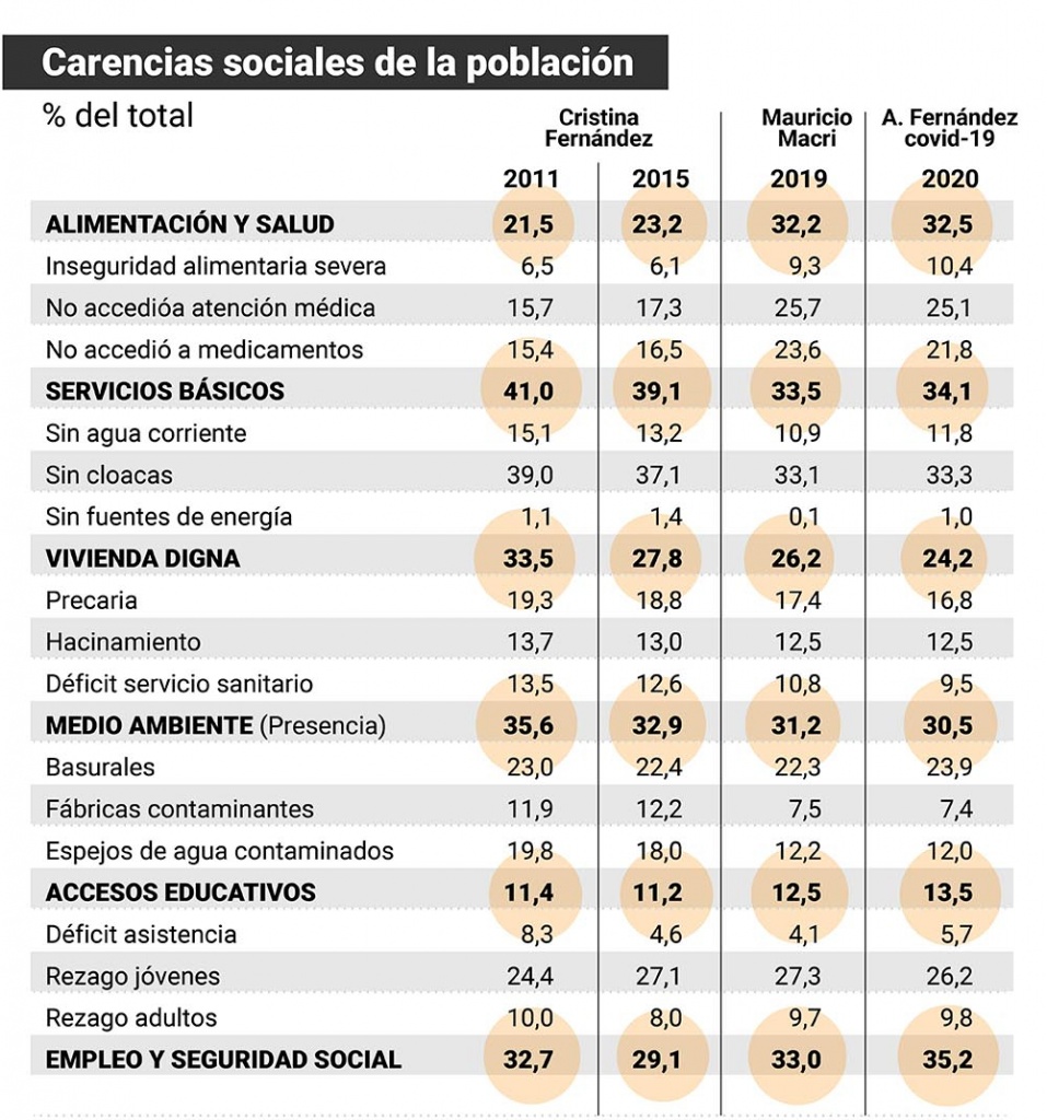 En cuanto a la dinámica del último año, el deterioro de la situación social y laboral hizo que un 12,8% de la población pasara a tener déficit en alguna dimensión de los derechos sociales, cuando en 2019 no lo tenía. Esta última situación tuvo mucha mayor gravedad en el conurbano bonaerense (esa transición afectó al 16,4% de la población) que en la ciudad de Buenos Aires (el índice resultó de 3%).